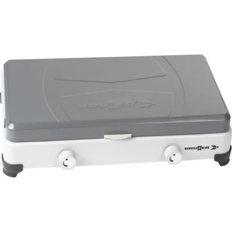 Fornello gas a 2 fuochi stabile e compatto, dotato di coperchio.
