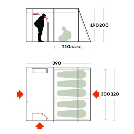 Accessori: Distanza del doppio tetto dalla base regolabile, per ottimale tensionamento. Pavimento su porta frontale apribile. Camera separata da divisorio amovibile. Apertura su doppio tetto per il passaggio dei cavi elettrici. Sistema di tiranti per fissare la tenda, multipoint per una maggiore resistenza strutturale in caso di forte vento. Gancio interno porta lampada. Ampia borsa a custodia in Supertex. Kit di riparazione. Istruzioni video per il montaggio attivabili con QRCode.